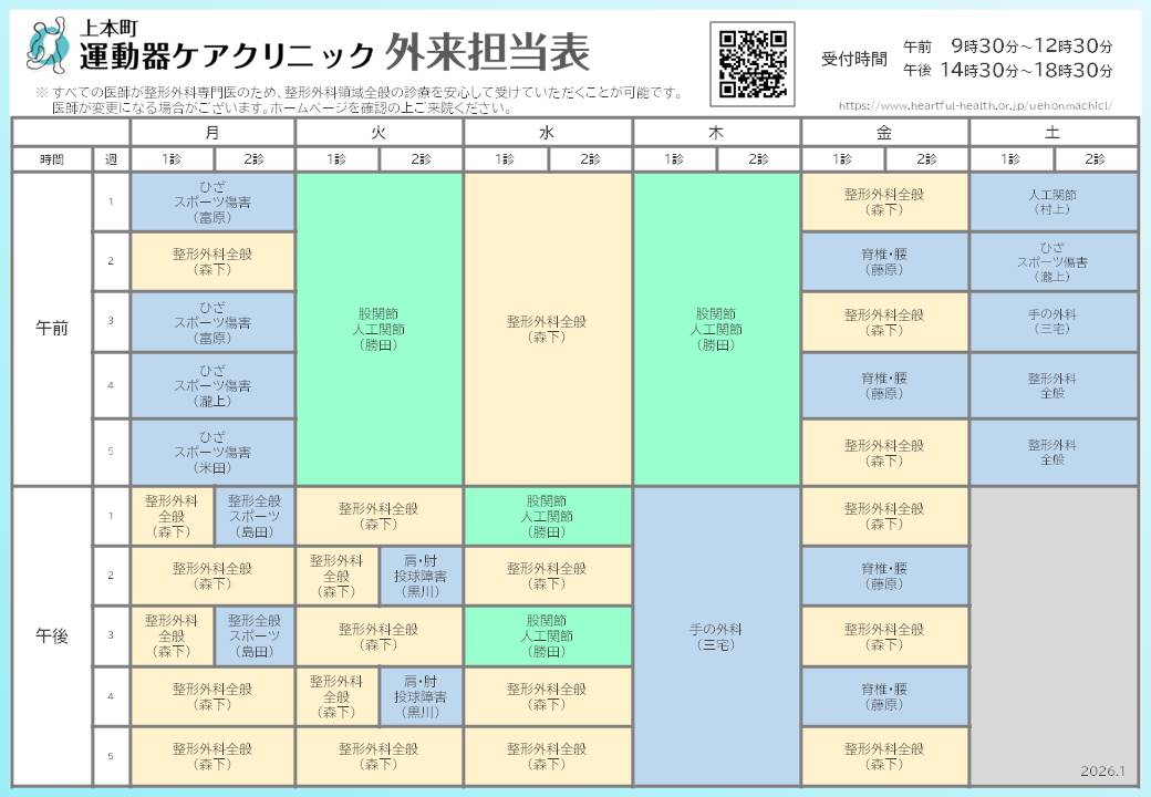 2026年1月より、外来担当医が下記のとおり変更になります。